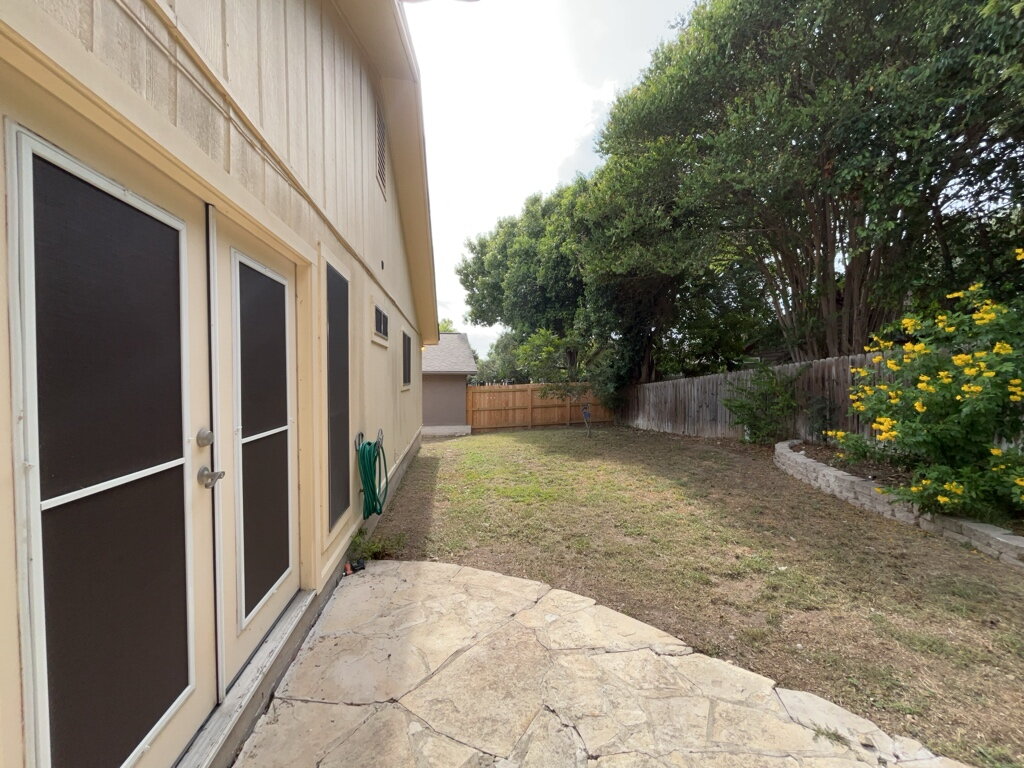 The primary bedroom offers a peaceful retreat with private outdoor access, a large walk-in closet and an ensuite bathroom featuring a double vanity and a tub/shower combo. Enjoy outdoor living with a patio shaded by mature trees, all within the privacy of a fenced backyard ideal for relaxing or hosting guests.