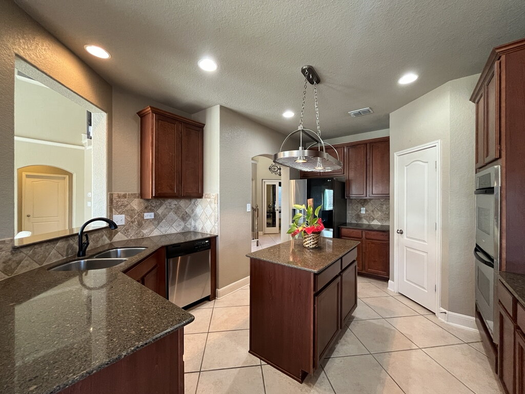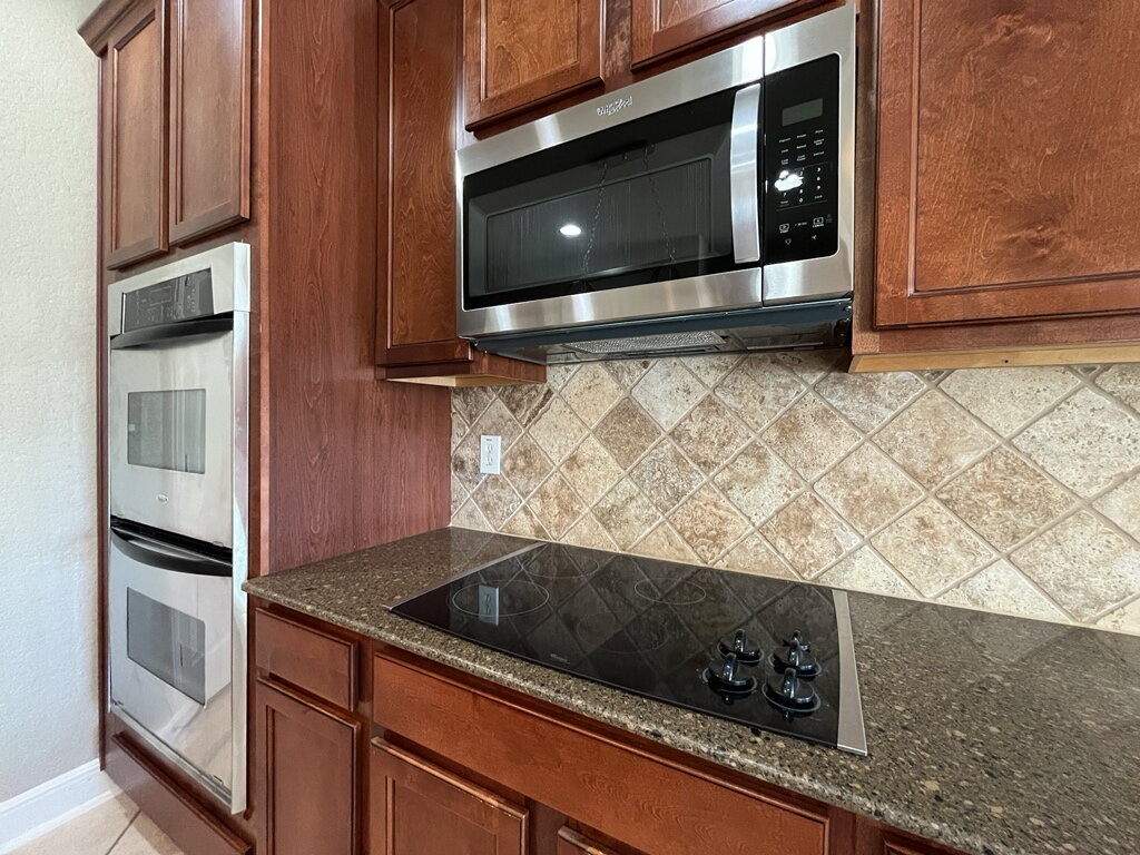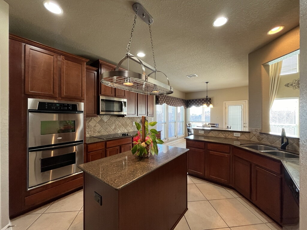 The kitchen is well-equipped and stylish, featuring a double built-in wall oven, electric glass cooktop, dishwasher, microwave, refrigerator, solid countertops, a center island, pantry, and an eat-in dining space, perfect for casual meals or hosting guests.